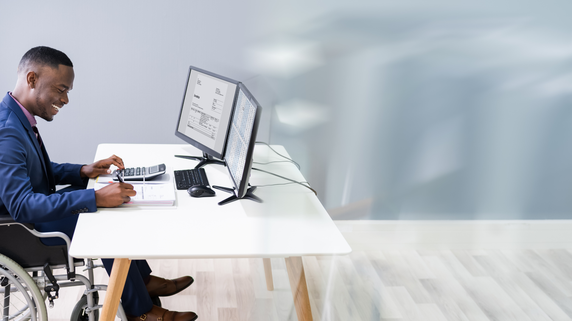 Person wearing a navy suit in a wheelchair working at a white desk. Person is smiling, writing in a notebook, using a calculator and computer. Credit: Canva