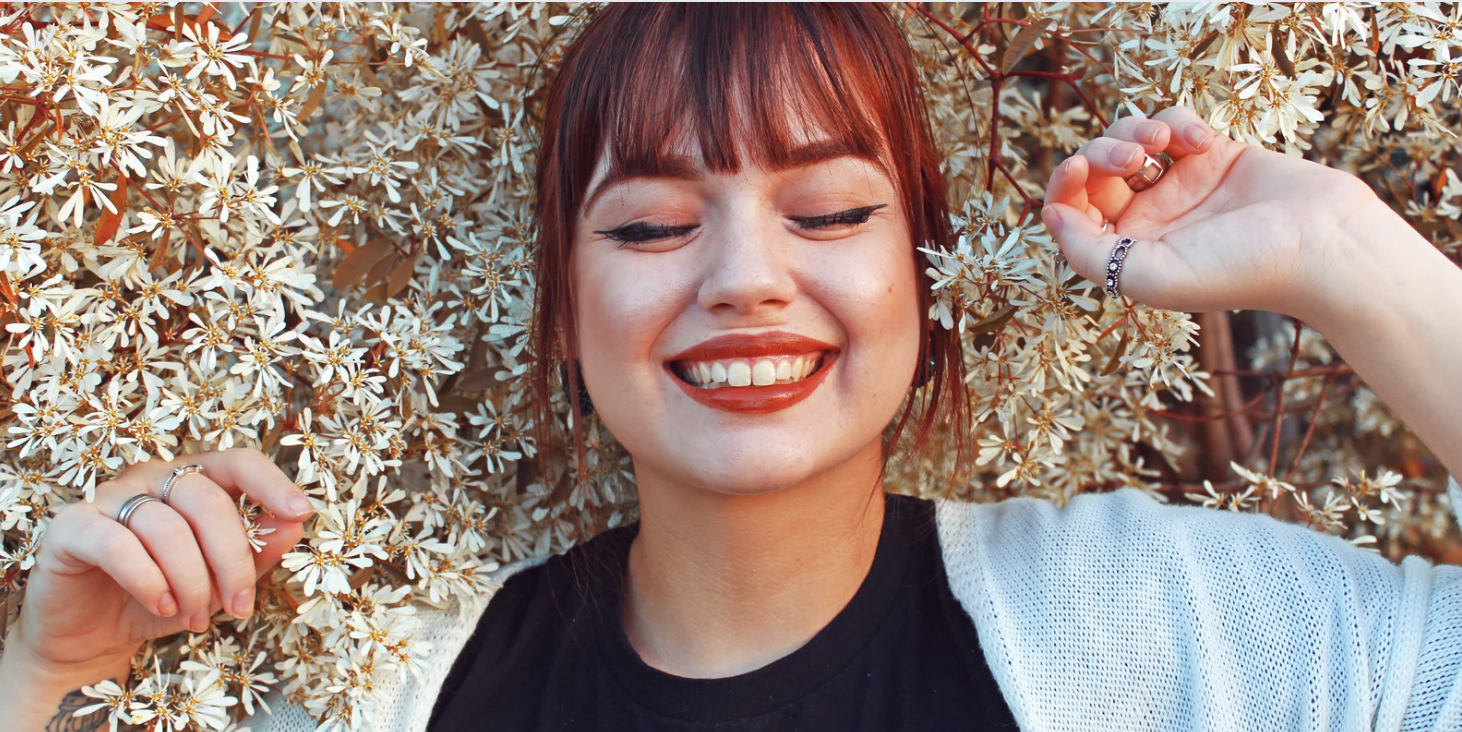Person smiling, eyes closed, with small white flowers behind them. Credit: Canva Stock Photos