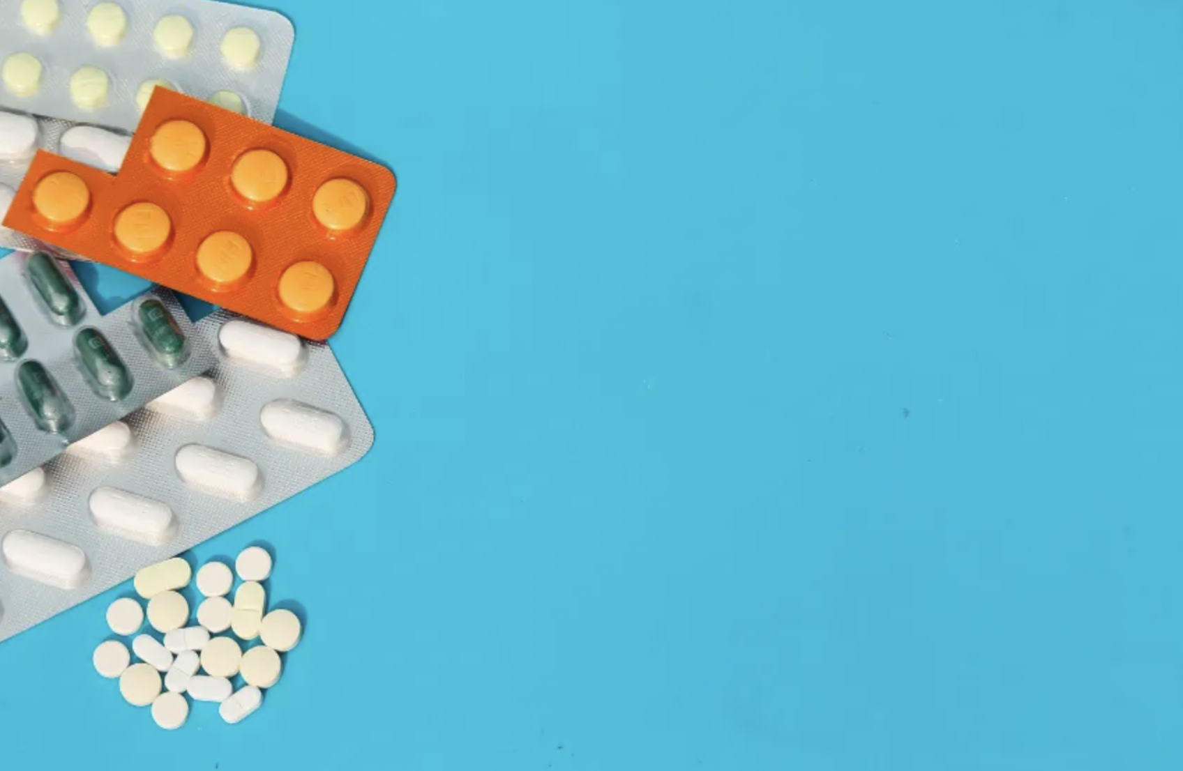 Against a light blue background, there are 5 pill blister packs and several loose pills. Credit: Canva