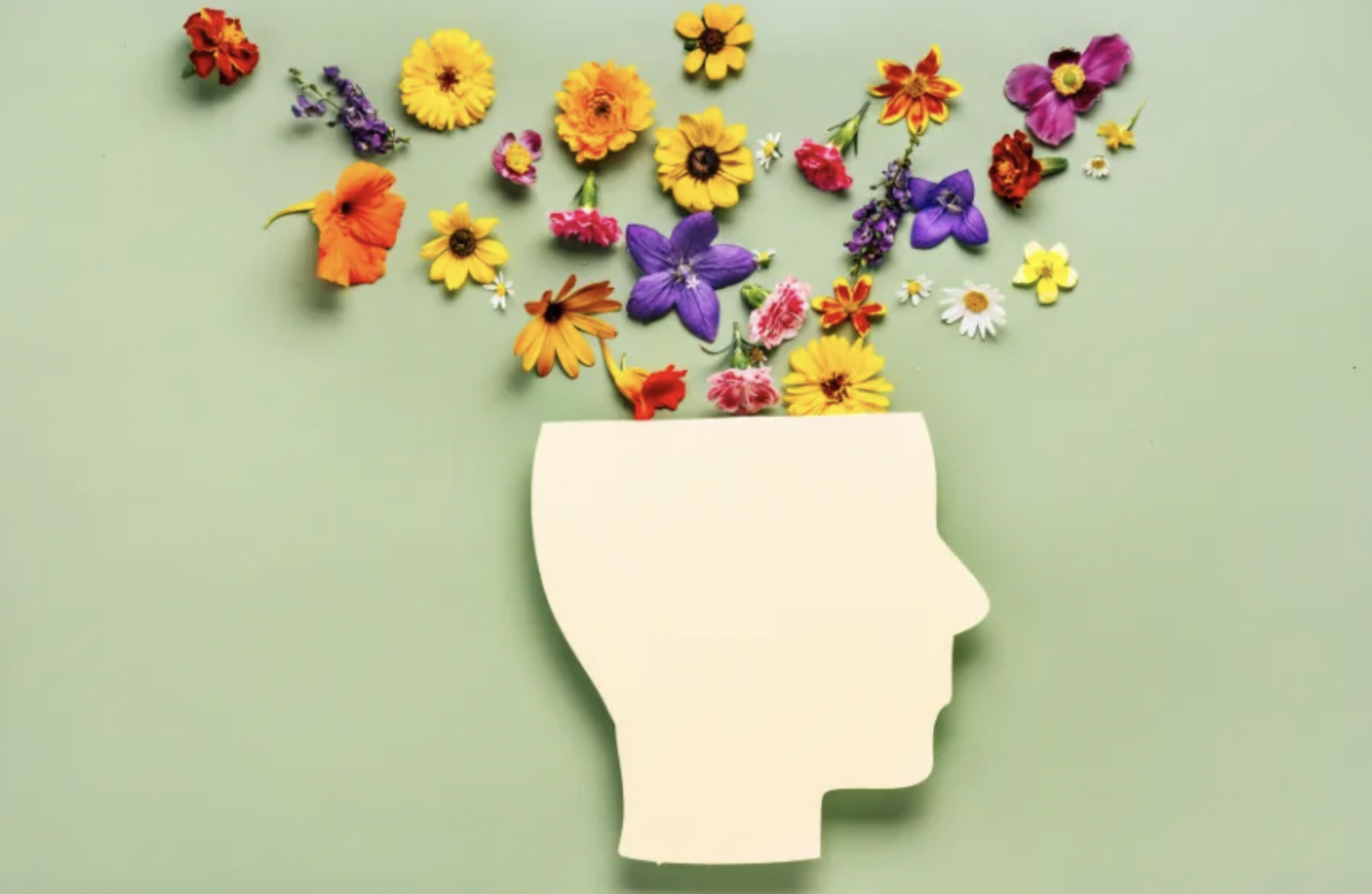 Image of collage. Against a green background, there is the profile of a face looking to the left. There are yellow, orange, pink, and purple flowers placed on top of the head, as if they were coming out of it. Credit: Canva.