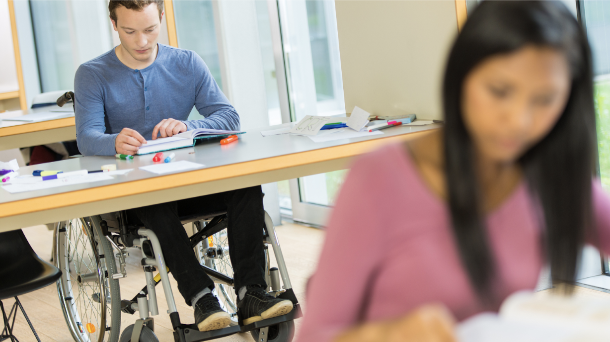 Student in wheelchair reading at a desk - he’s wearing a blue shirt, black pants. Another student with long hair, pink shirt, blurred at the desk in front of him. Canva